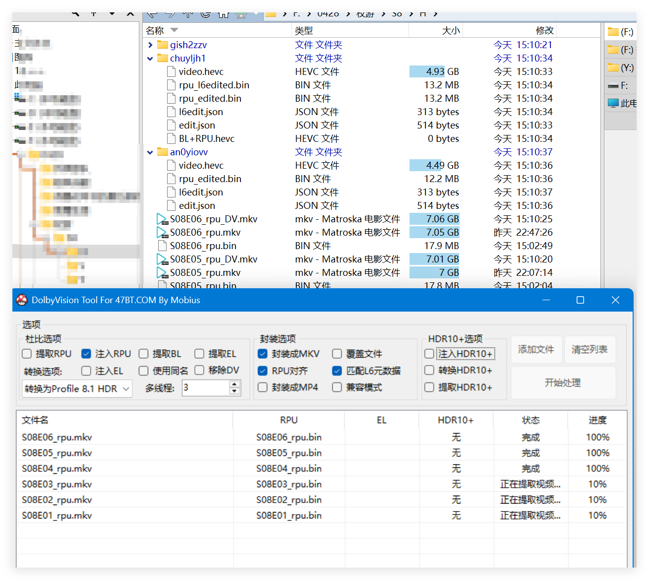 C#编写,本体算上图标一起123KB..如果算上dovi_tool.exe和hdr10plus_tool.exe等等工具,不超过60M.比原来D9论坛的那个老外的CMD工具足足减少了200M.而且他的不能批量..反正我就是针对他的这个工具来定制写的...