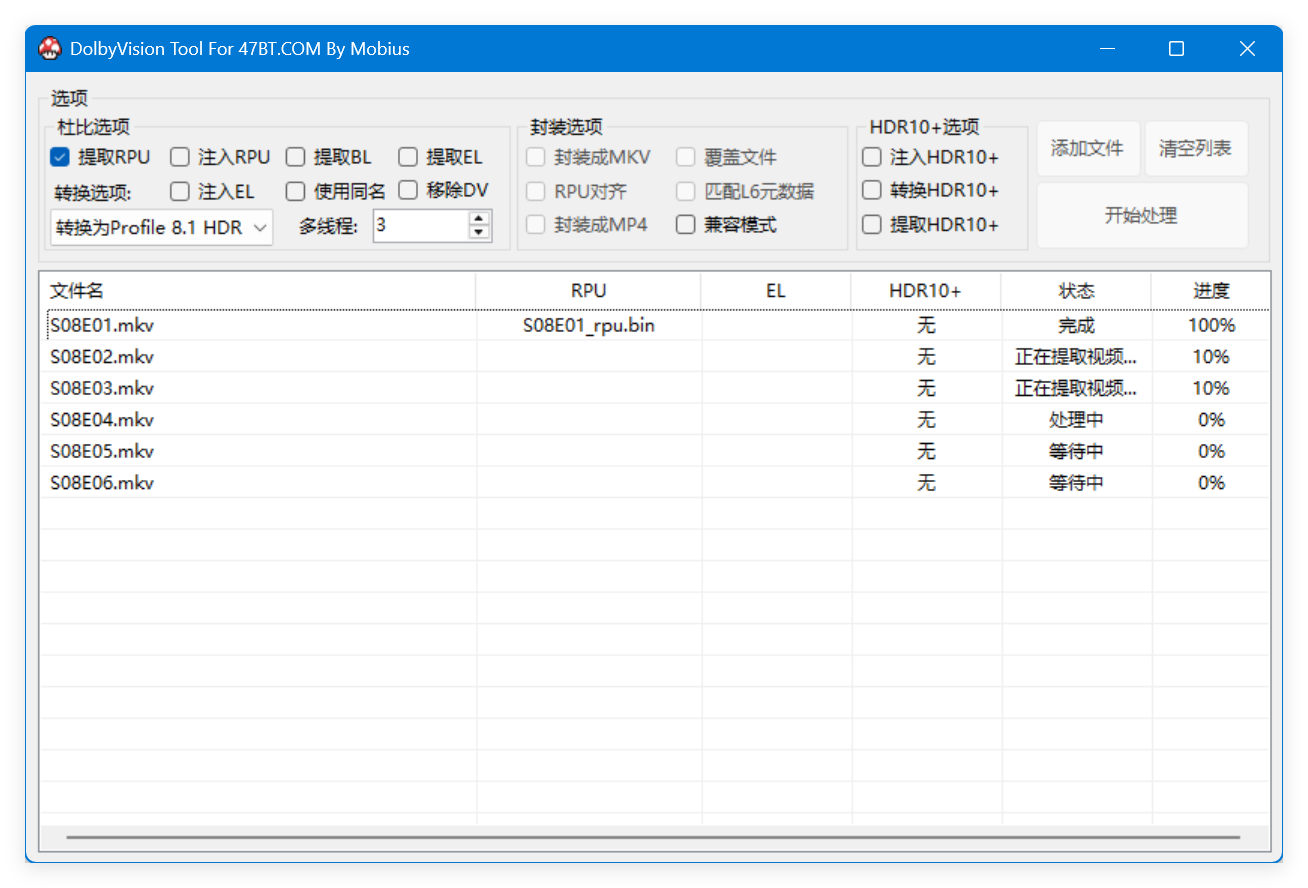 - 自动识别当前视频杜比版本和转换目标版本,如果一致则直接提取,