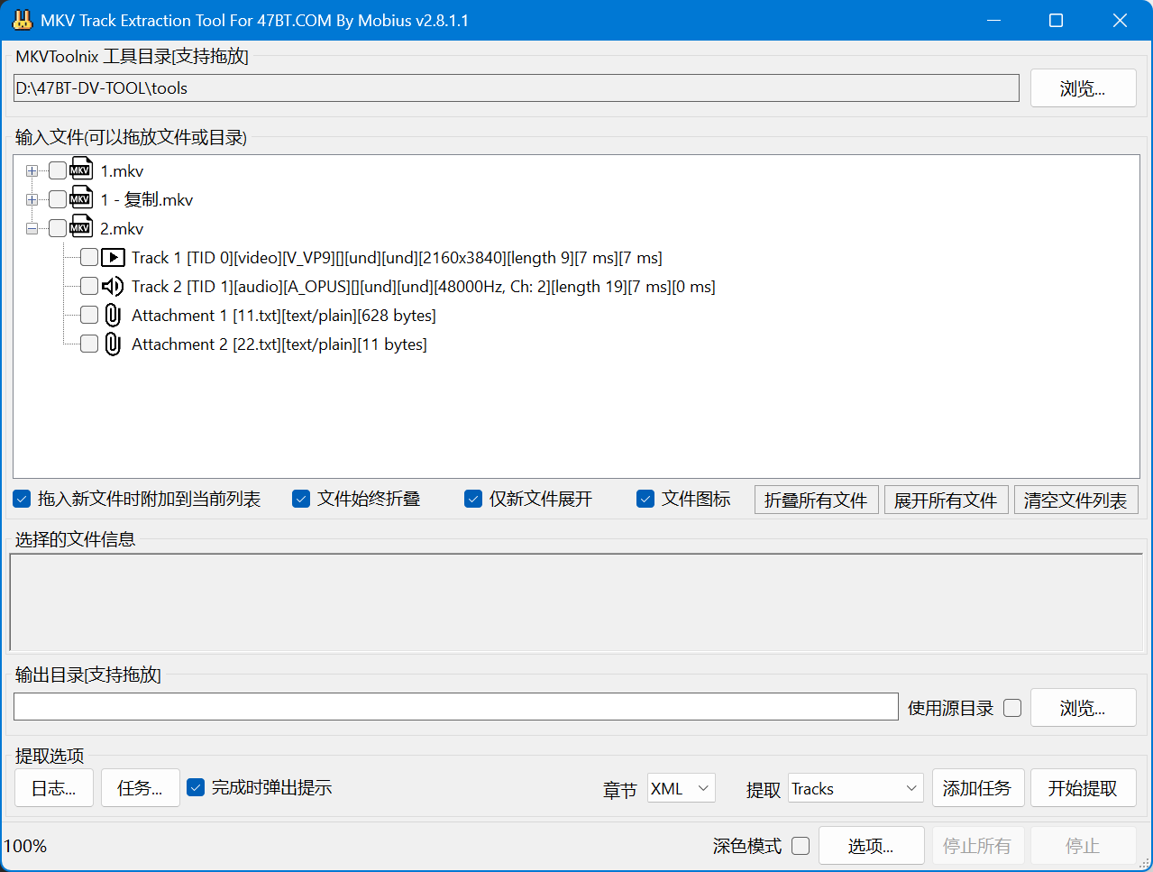 }再就是做了大量的代码优化,这就不贴出来了,然后主界面上的进度条在不工作的时候改成了不显示,不然左下角一个空缺看着不舒服,添加了一个关闭软件时,最小化到托盘区域的功能,后面看兴趣吧,如果有兴趣和有必要,我看要不要把软件改成多任务同时进行的,以提高提取效率.虽然我已经优化了相关代码..然后我不喜欢软件目录和什么配置文件以及DLL文件全部都放在一起,我喜欢层级感,所以DLL文件和配置文件同一移动到了Config目录中,然后我编译的DLL文件名字改成了MKVExtractCore.dll,其他的改动想不起来了...